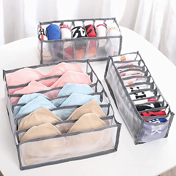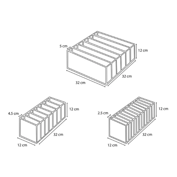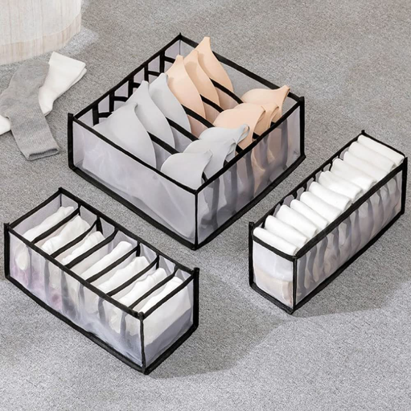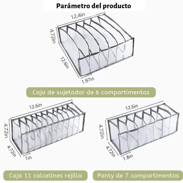 3 diseños con diferente cantidad de compartimentos en diferentes tamaños. Incluye: 6 rejillas (para sujetadores), 7 rejillas (para calzoncillos) y 11 rejillas (para calcetines) .